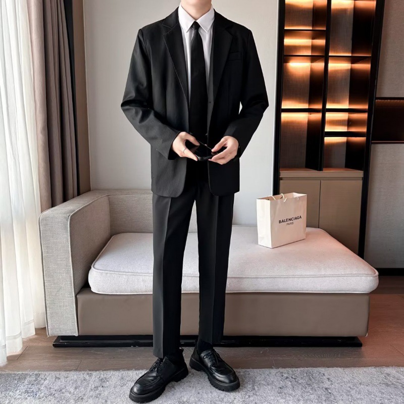 Tiktok setelan bisnis pria, pakaian kelas atas gaya Amerika hitam murni, jas lurus drop-down untuk lelaki