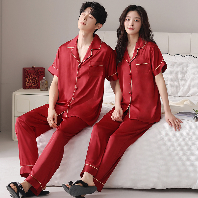 Baju Tidur Pasangan Sutra Es Warna Merah Besar Musim Panas Dingin Lengan Pendek Celana Panjang Sutra Pernikahan Meriah Pakaian Rumah Pengantin Baru Pria dan Wanita