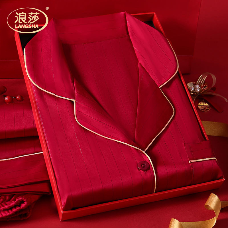 Piyama merah Langsha untuk pasangan pengantin, set piyama sutra es musim semi dan panas untuk pengantin pria dan wanita, piyama perayaan pernikahan
