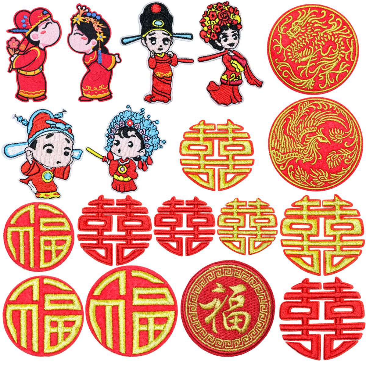 Stiker kain Cina stiker kemeja merah meriah patch foto kerah stiker bordir gaya opera kata pengantin laki-laki pengantin bahagia ganda