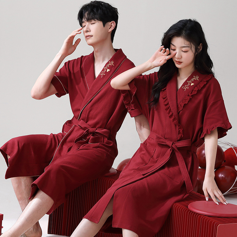 Gaun malam pasangan katun musim panas pria dan wanita, piyama panjang setengah panjang gaun pagi merah pernikahan pengantin perempuan