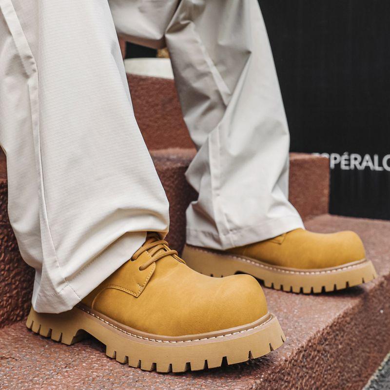 Sepatu Derby Kuning Sepatu Kulit Kepala Besar Kulit Lembut Bernapas Musim Panas Pria Sepatu Jas Pengantin Pria Sol Tebal Gaya Inggris