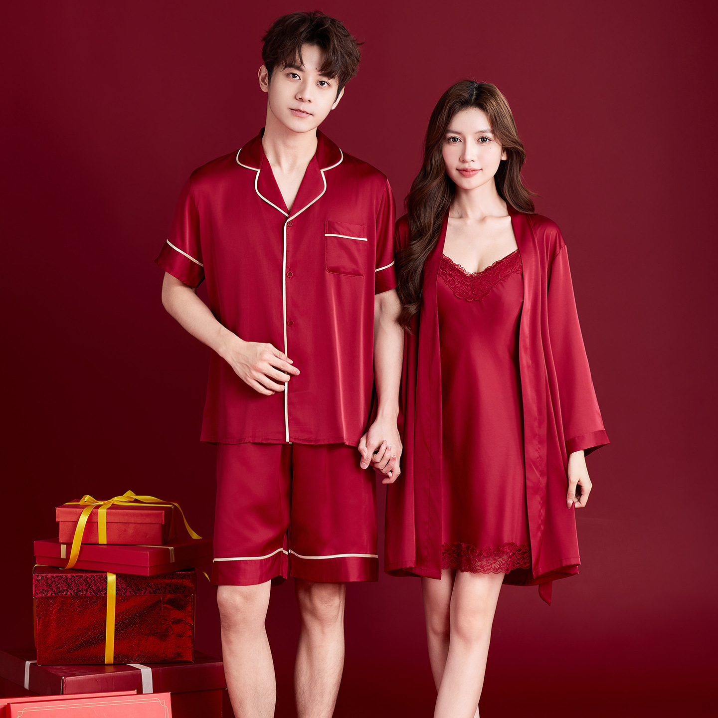 Musim Semi dan Musim Gugur Tahun Baru merah meriah es sutra pasangan piyama wanita tali baju tidur setelan pakaian rumah