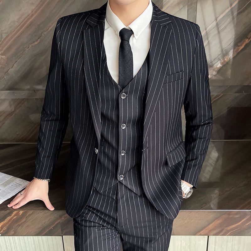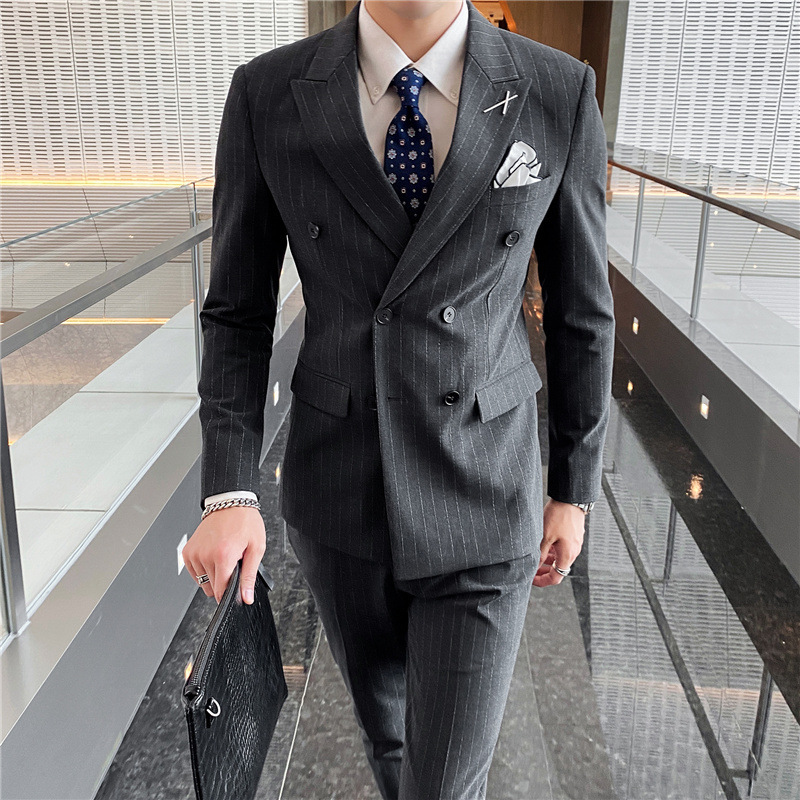 Setelan formal bisnis pria, pakaian tiga potong jas pernikahan, slim fit ramping dada ganda, pakaian formal bisnis bergaris musim semi dan musim gugur