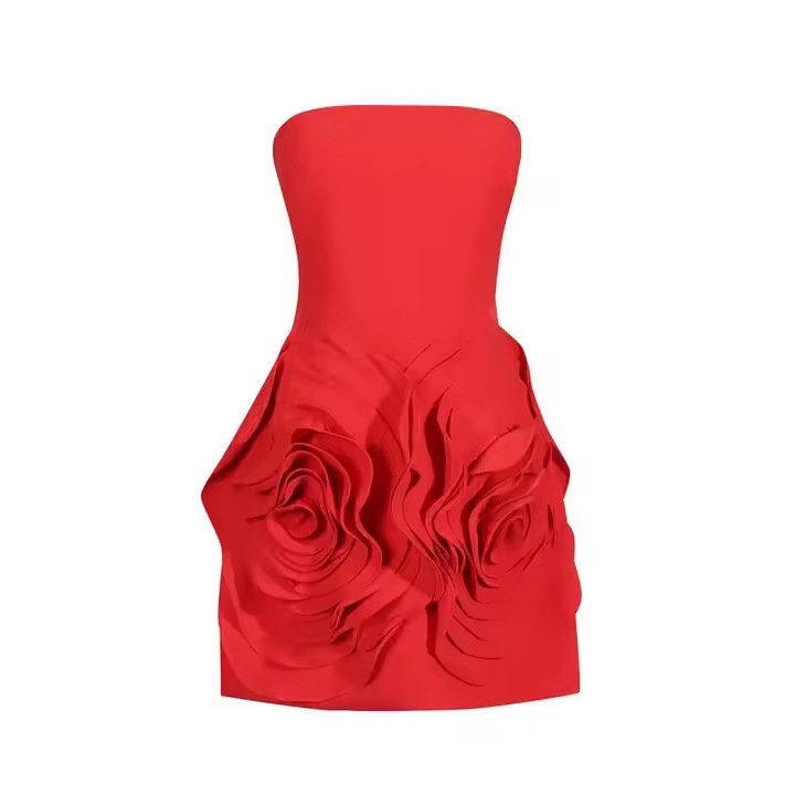 Gaun Pesta Makan Malam Seksi Perdagangan Luar Negeri Eropa dan Amerika Rok Pendek Payudara Bunga 3D Tiga Dimensi Rok Huruf A Murni
