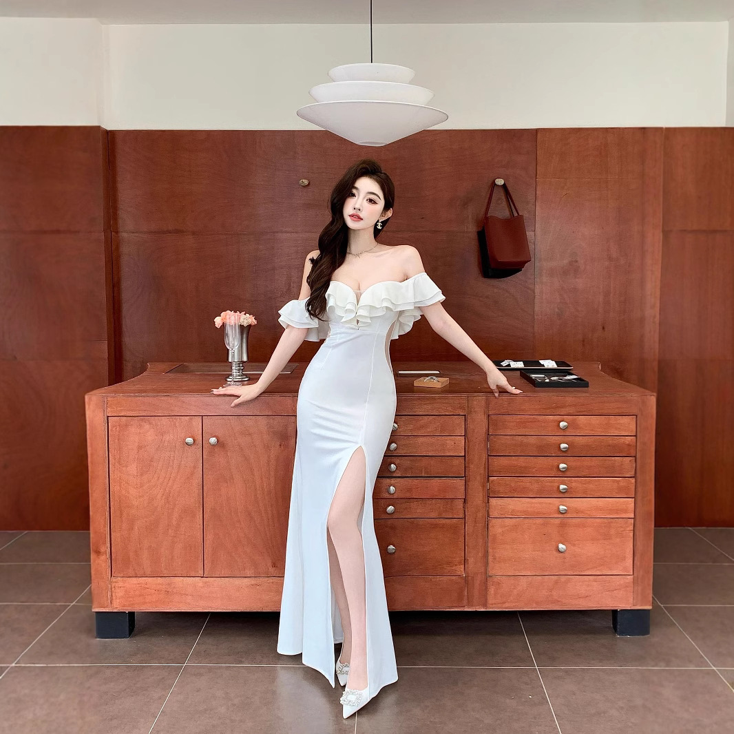 Rok Panjang Warna Putih dengan Bagian Teratai Seksi Gaun Malam Slim Fit Model Panjang Bercabang Elegan Gaun Pesta Perjamuan Tuan Rumah Dewasa