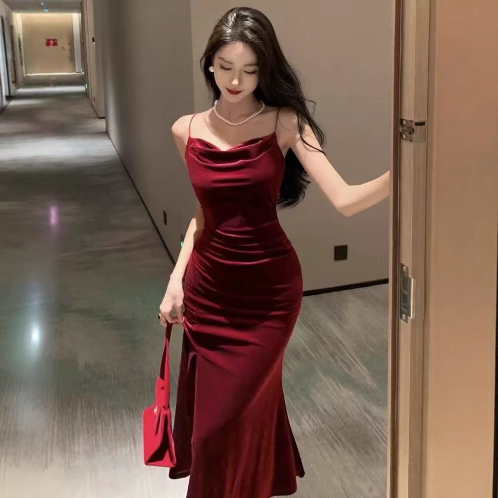 Gaun Suspender Beludru Emas Model Prancis Kelas Atas Wanita Rok Panjang Ekor Ikan Ketat Seksi Musim Gugur Musim Dingin Rok Gaun Bungkus Pinggul Bercabang