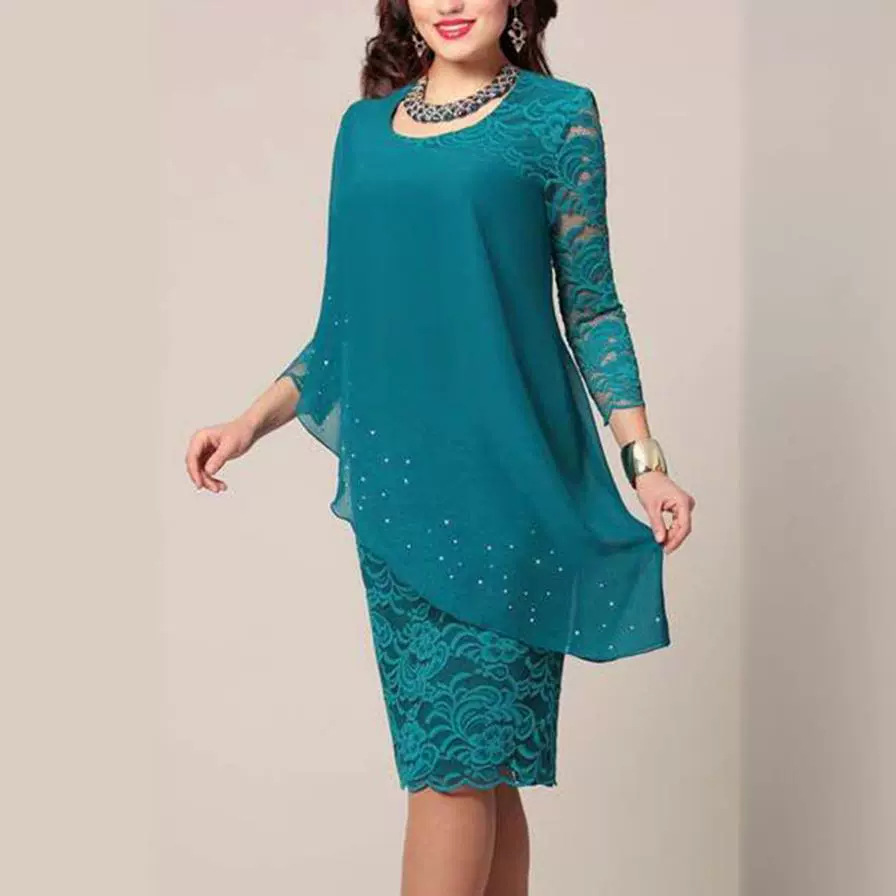 Gaun Slim-fit Lengan 3/4 Elegan Renda Kombinasi Warna Polos EMAS