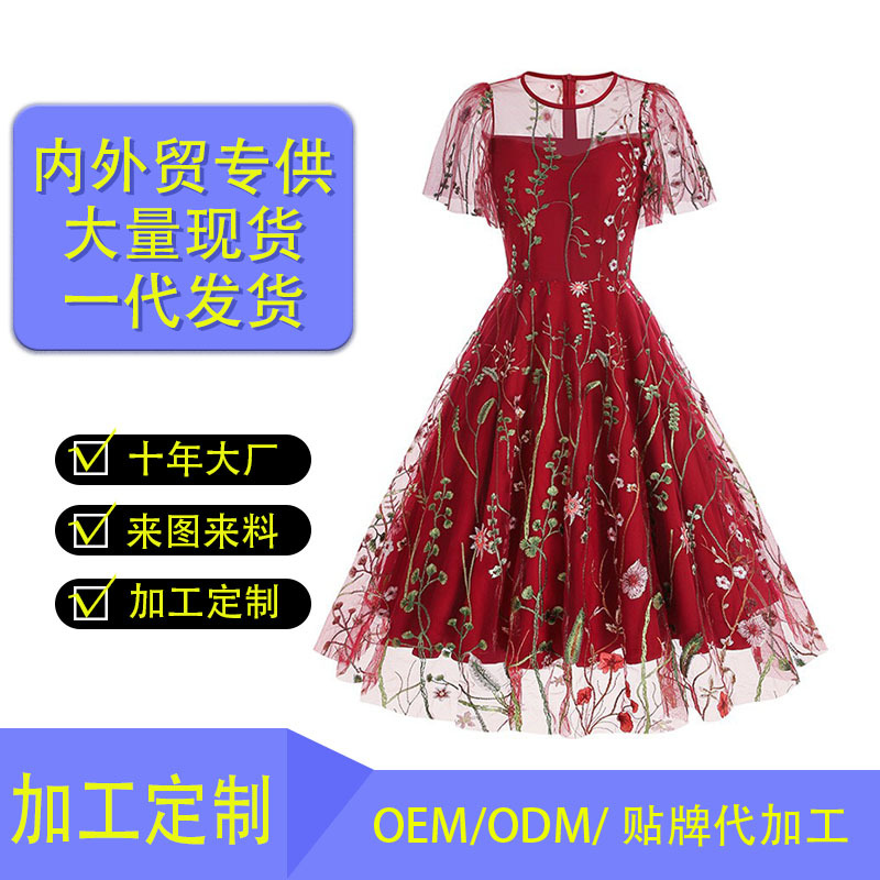 Amazon gaun bordir lengan pendek kerah bulat lintas batas Eropa dan Amerika gaun bordir berat 50s 8235