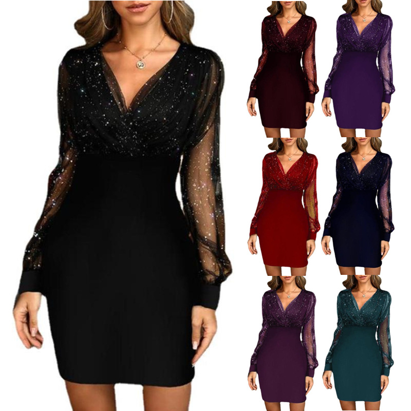 Gaun lengan panjang seksi perdagangan luar negeri gaun payet leher V jala stasiun independen Amazon pakaian wanita lintas batas Eropa dan Amerika