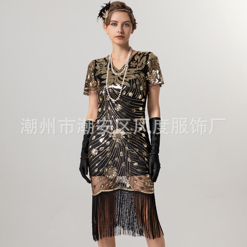 Gaun Payet Rumbai 2020 s Rok Gaun Slim-fit Lengan Pendek Pesta Pesta Retro Eropa Amerika Amazon Lintas Batas