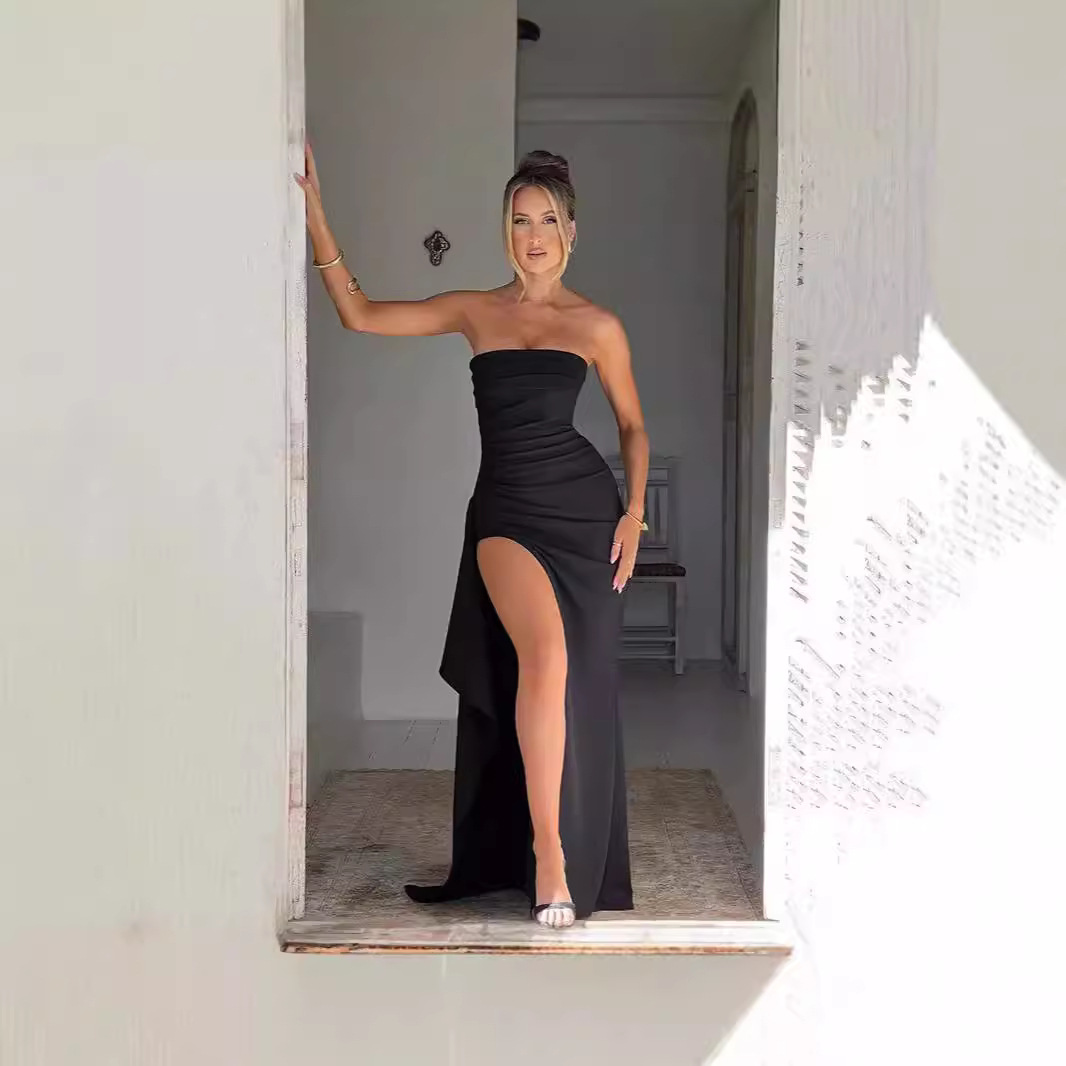 INS2025 Musim Semi dan Musim Panas Model Baru Tali Gantung Seksi Lintas Batas Eropa dan Amerika Gaun A-line Dada Rendah Pakaian Wanita Gaun Bercabang Slim-fit