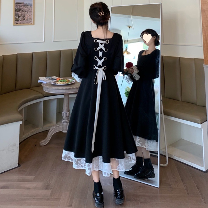 Awal musim gugur 2023baru Gaun lengan puff renda pita pinggang jalanan goreng merah online gaun putri