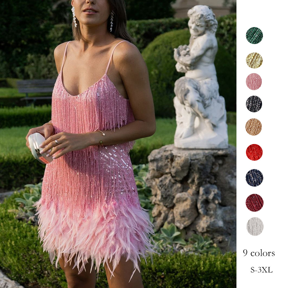 Gaun payet rumbai bulu wanita lintas batas Musim Semi dan Musim Panas 2024 gaun kecil berpayet tali leher-v seksi untuk wanita