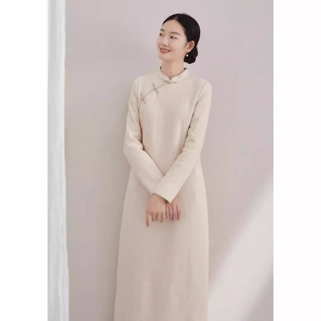 Gaun Cheongsam Wol Kerah Bulat Satu Kancing Gaya Baru Musim Gugur/Dingin 2025, Gaun Cheongsam Artistik Gaya Cina untuk Wanita.