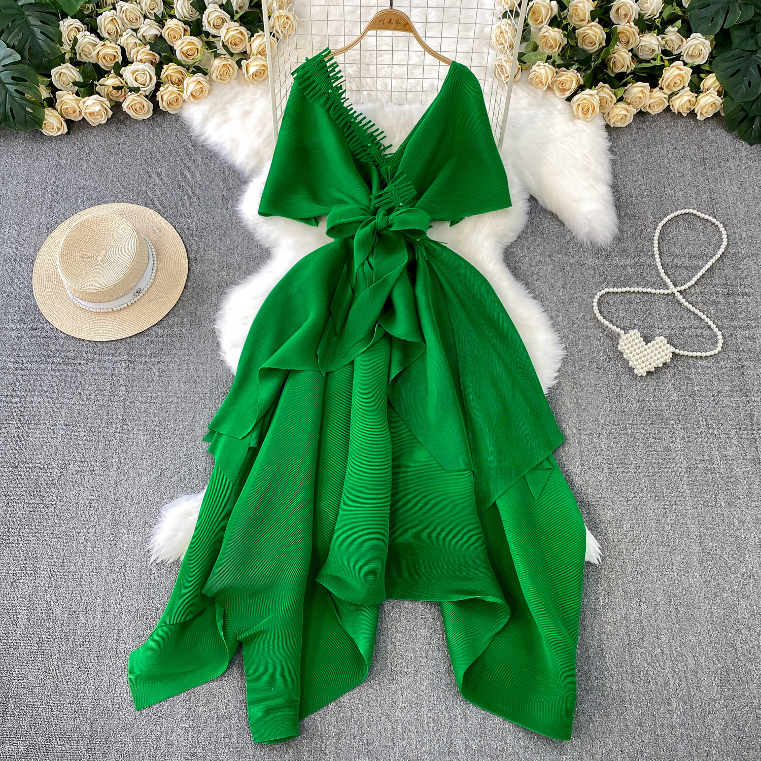 Gaun Kerah V Seksi Berlipit Miyake High-end Setelan Rok Panjang Tidak Beraturan Terlihat Kurus Pinggang Ketat Berkualitas Tinggi Wanita