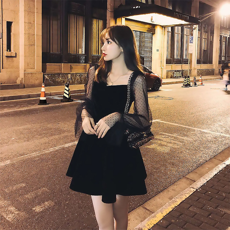 Gaun lengan panjang retro wanita, gaun wanita kerah persegi hitam garis A lengan jala elegan gaya Korea Musim Semi dan Gugur