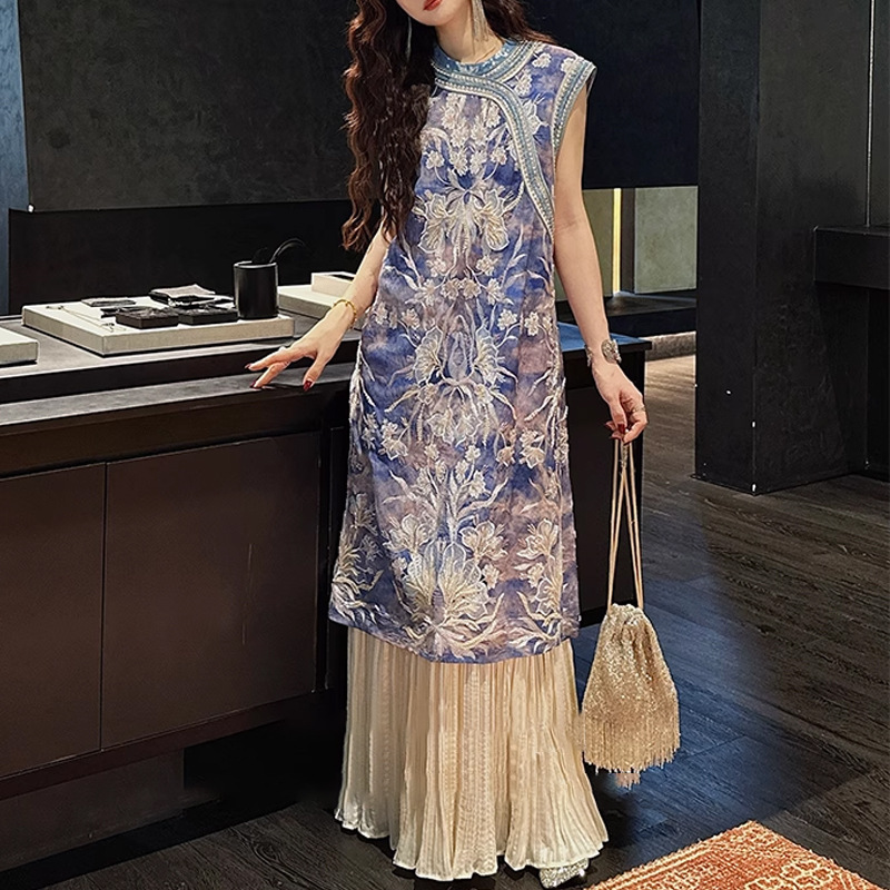 [Rias Wajah] Gaun Cheongsam Lukisan Tangan Bordir Manik-Manik Pekerja Berat Gaun Tanpa Lengan Elegan