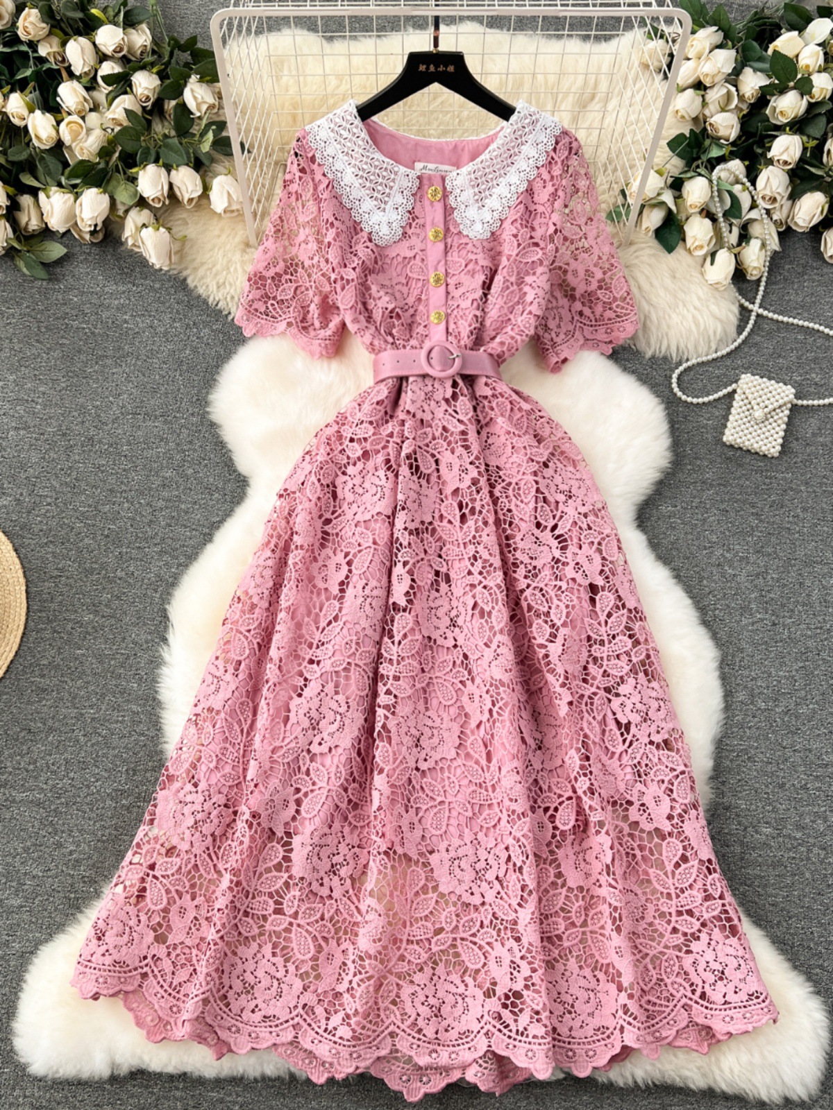 Amazon 2023 musim semi gaun renda baru Perdagangan Luar Negeri Eropa dan Amerika V-neck gaun Lengan bel renda berongga