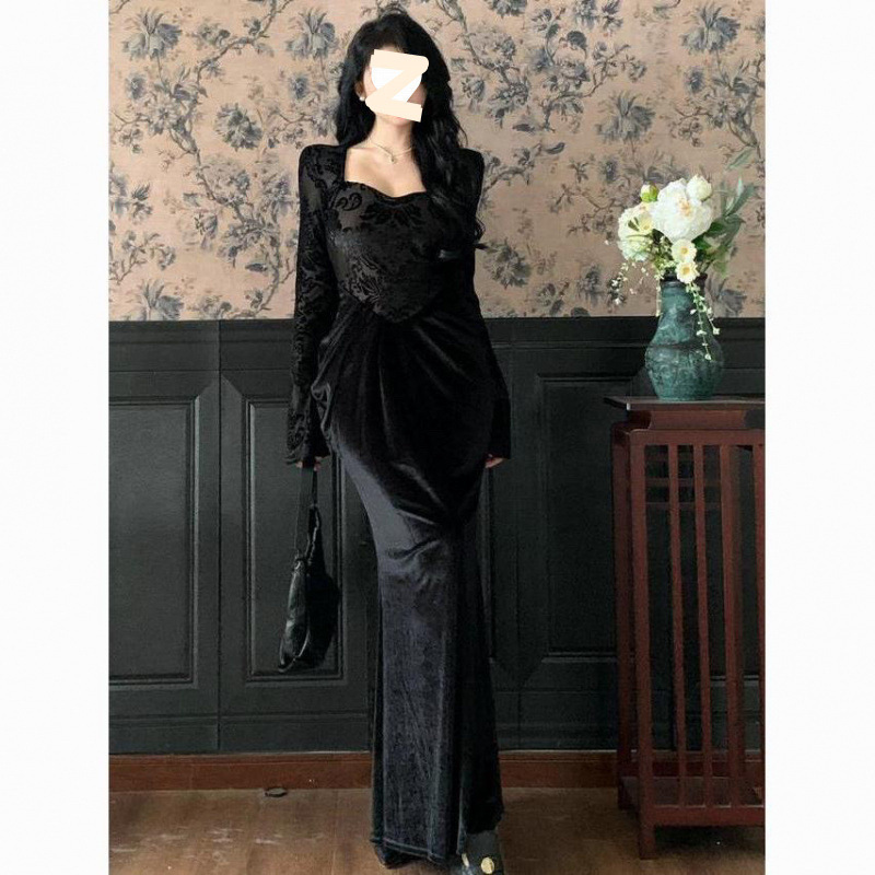 Gaun Lengan Panjang Gaun Pinggul Kerah Persegi Beludru Terlihat Ramping Sosialita Mewah Ringan Retro Model Baru Musim Gugur Musim Dingin Ukuran Besar