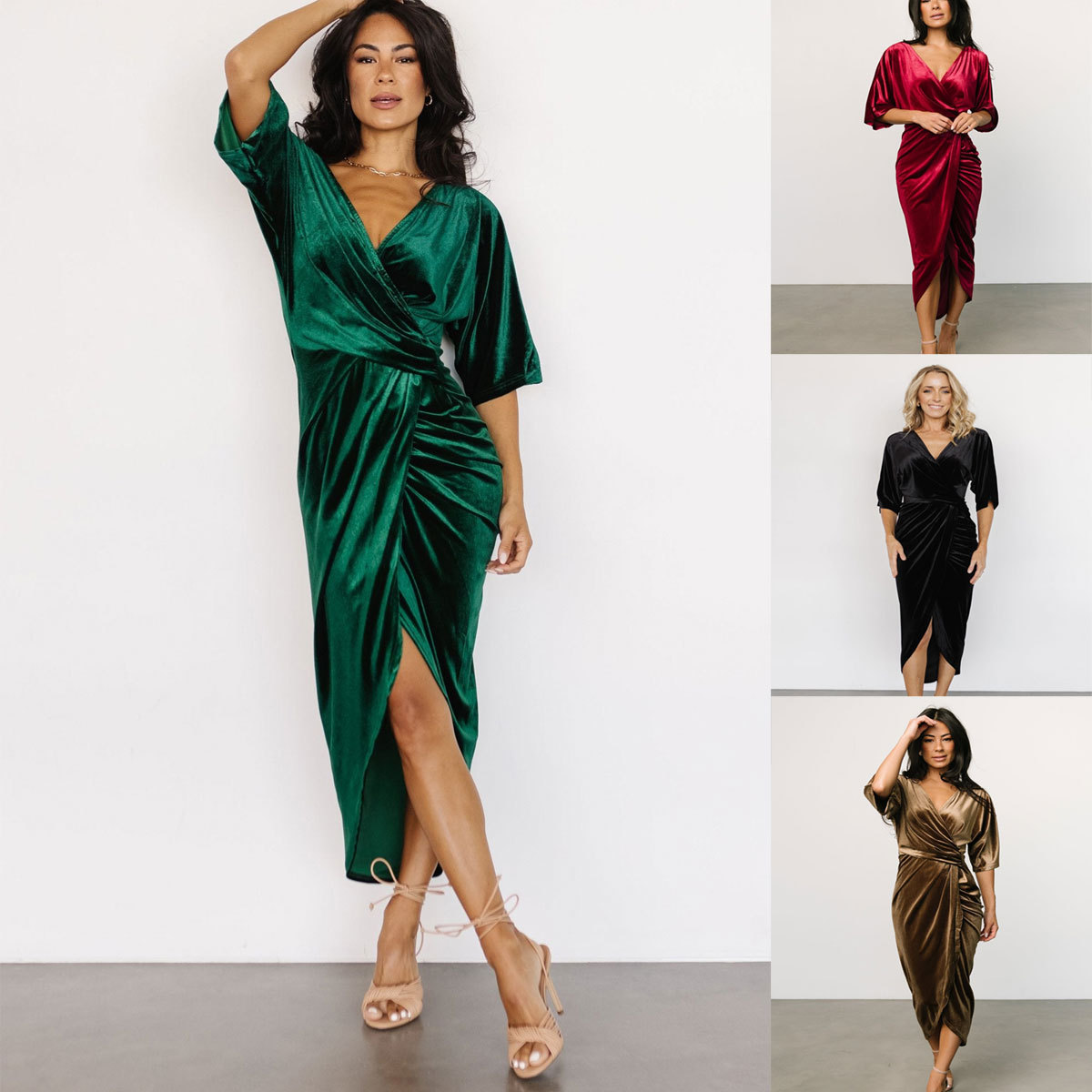 Gaun beludru emas Amazon lintas batas, Gaun malam seksi tidak rata Eropa dan Amerika baru 2023