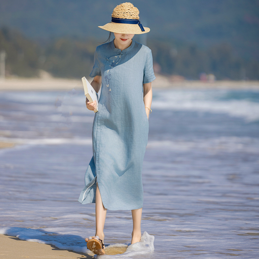 Gaun katun linen modifikasi cheongsam warna kontras terpisah cetak rami baru musim panas 2023