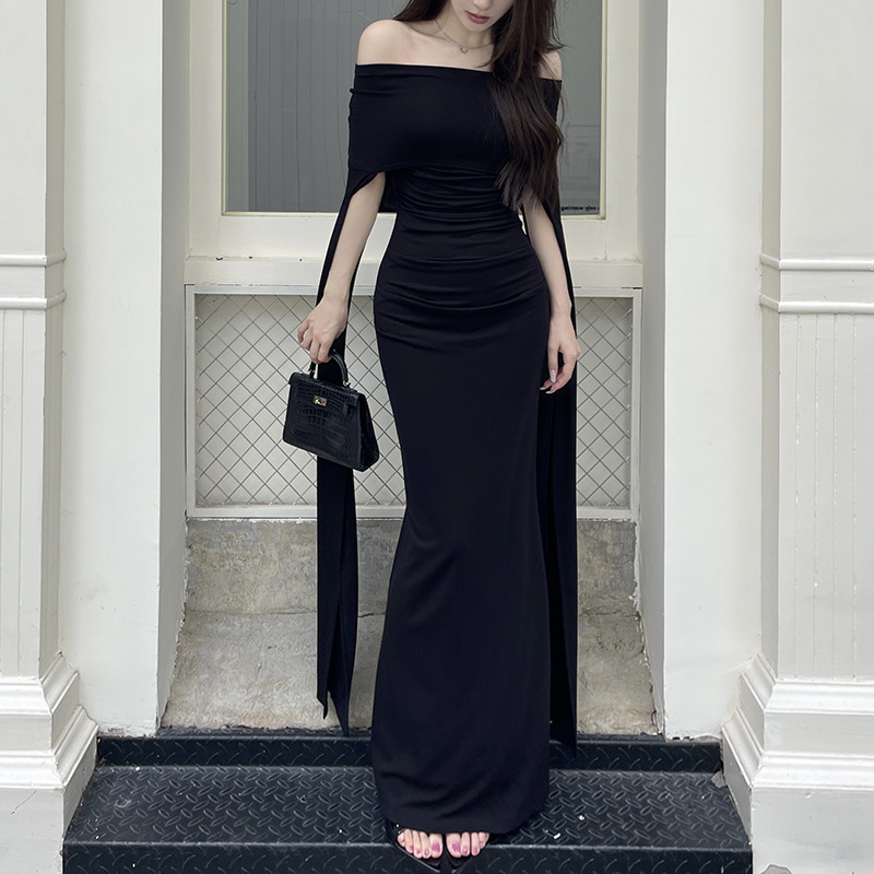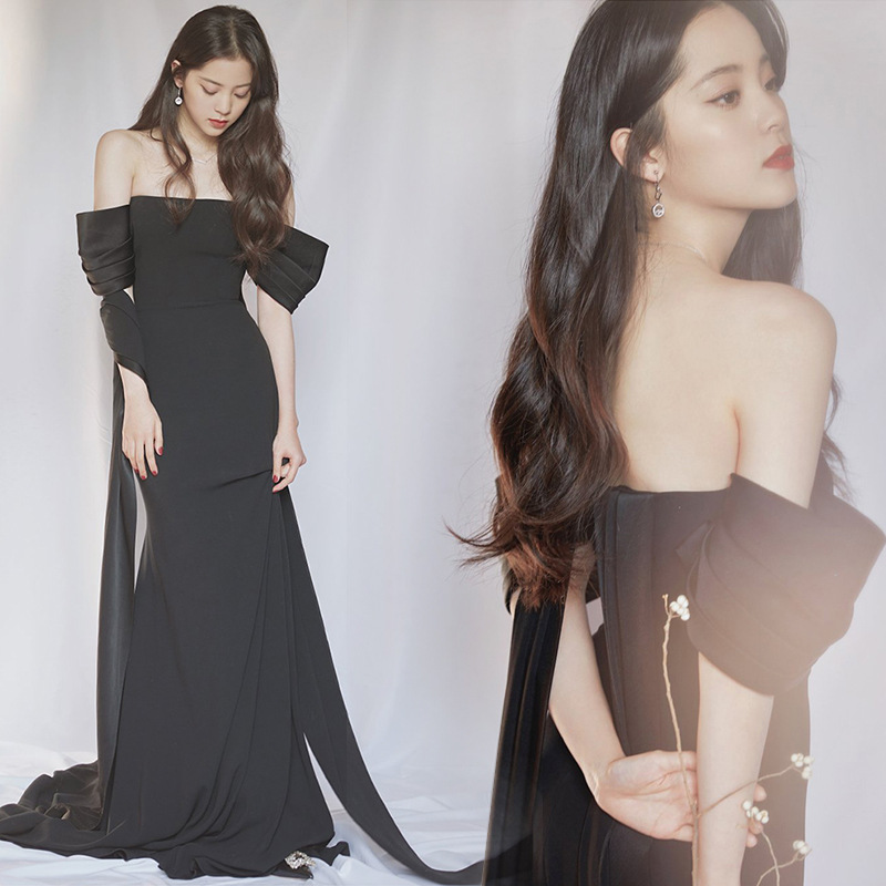Gaun malam hitam 2026 gaya Prancis baru, gaun malam mewah kelas atas untuk pembawa acara rapat tahunan dan ujian pertunjukan, lengan panjang