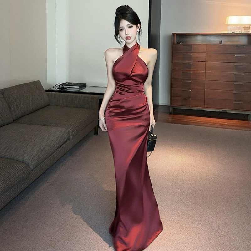 18YXC88欧美2026跨境外贸高端名媛风缎面挂脖露背宴会礼服连衣裙
