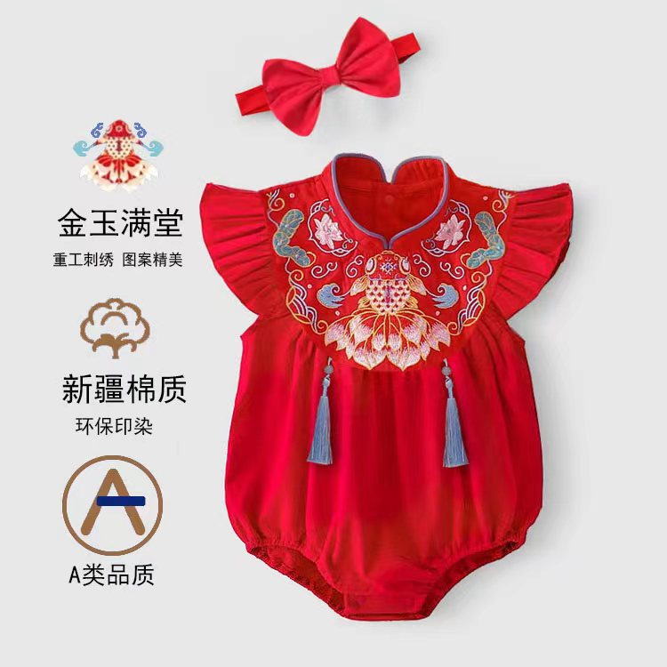 Jumpsuit bayi perempuan, jumpsuit lengan pendek gaya China musim panas baju monyet bayi usia seratus hari penangkap minggu gaun merah