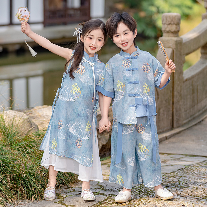 Pakaian Hanfu Pakaian Musim Panas Anak Laki-Laki Gaya Cina Baru Gaya Cina Cheongsam Anak Perempuan Setelan Model Tipis Kakak dan Adik
