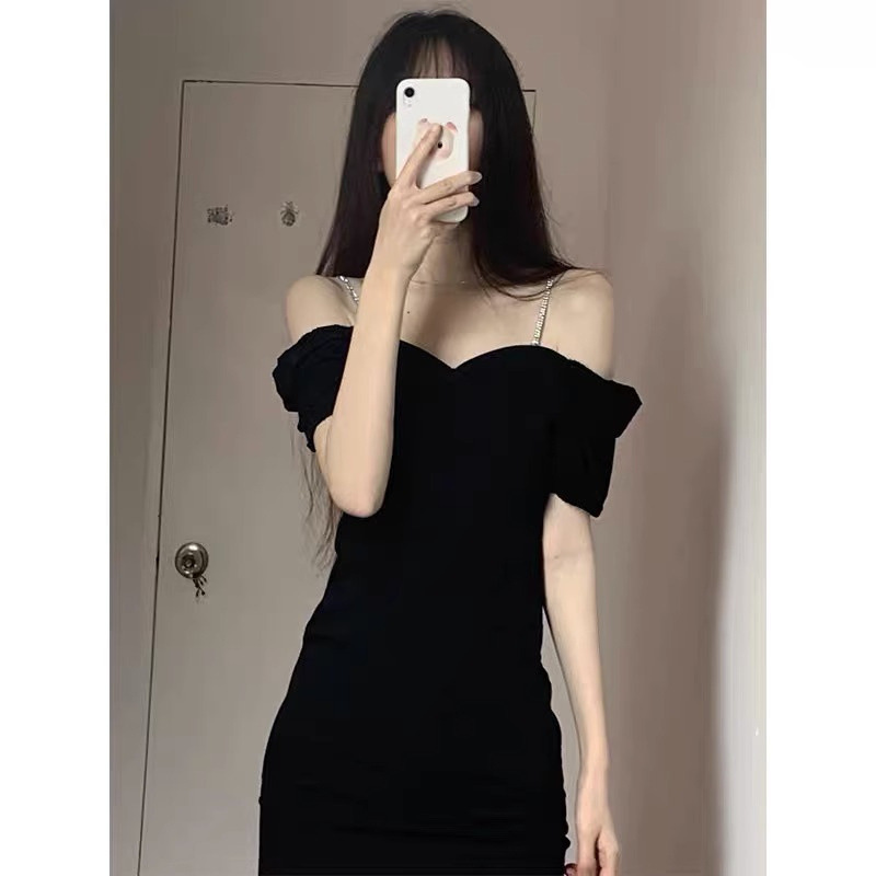 Gaun hitam kecil gaun ulang tahun gaya Hepburn mewah kelas atas gaun selempang bahu terbuka hitam seksi gadis seksi