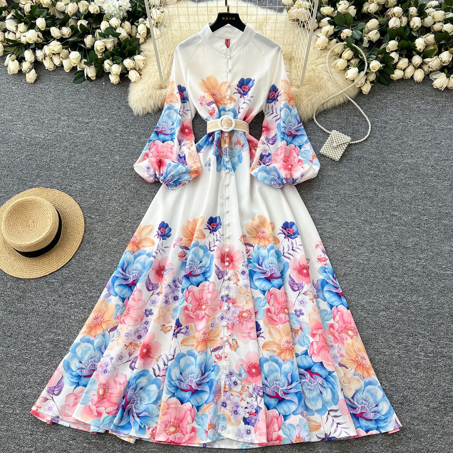 Gaun Wanita Gaya Prancis Gaun Panjang Bermotif Satu Bait Kancing Pinggang Lengan Lentera Kerah Tegak Retro Istana Model Baru 2025