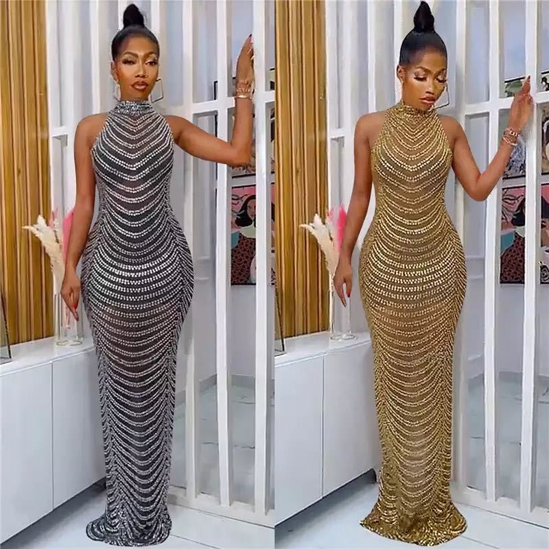 Pasokan Lintas Batas Wanita Afrika Rok Panjang Elegan Manik-Manik Berlian Teratai Kerah V Membentuk Badan Wanita Afrika