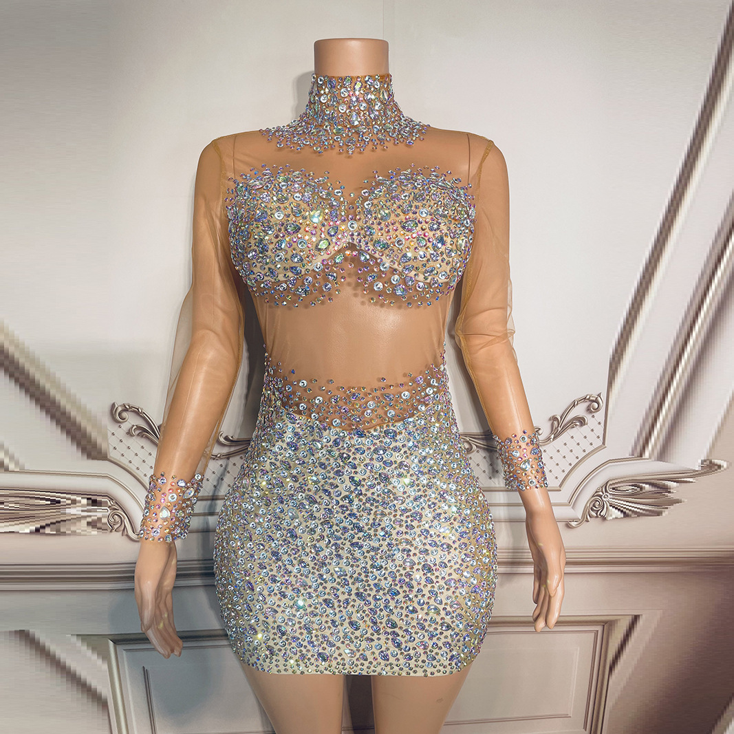 Gaun perban menawan ramping berlian jaring Leher V lengan panjang seksi populer Eropa dan Amerika gaun pesta rok pendek gaun malam