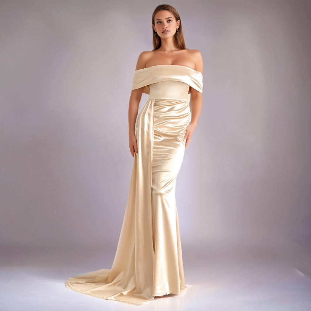 Gaun malam pinggang tinggi atasan tabung off-neck satin warna polos gaya Eropa dan Amerika gaun ekor ikan gaun rok panjang
