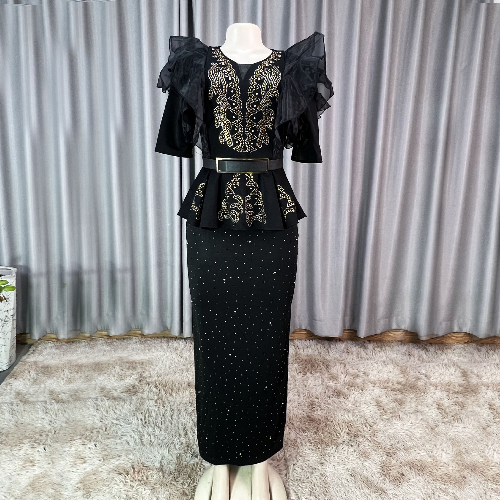 Pasokan Lintas Batas Wanita Afrika Rok Panjang Elegan Manik-Manik Berlian Teratai Kerah V Membentuk Badan Wanita Afrika