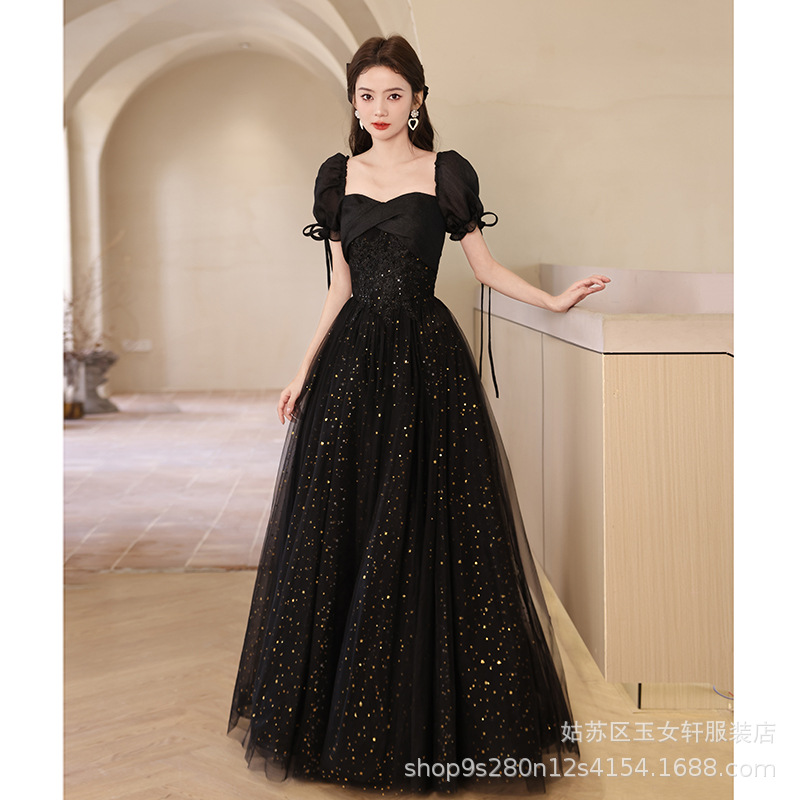 Gaun malam hitam 2024 gaya Perancis kelas atas cahaya mewah niche host high-end seni ujian pertemuan tahunan kilat