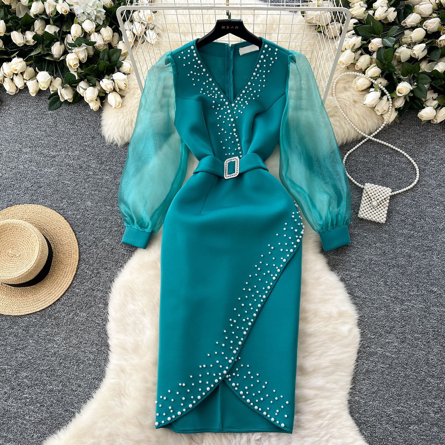 Gaun Pesta Lintas Batas Wanita Gaun Gaya Barat Eropa dan Amerika Rok Panjang Kombinasi Kerah V Manik-manik Kancing Industri Berat Modis