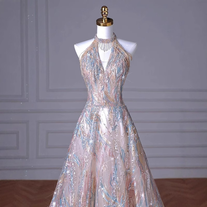 Gaun malam halter Prancis 2024, gaun Pertemuan Tahunan pengantin perempuan berpayet host niche mewah ringan baru