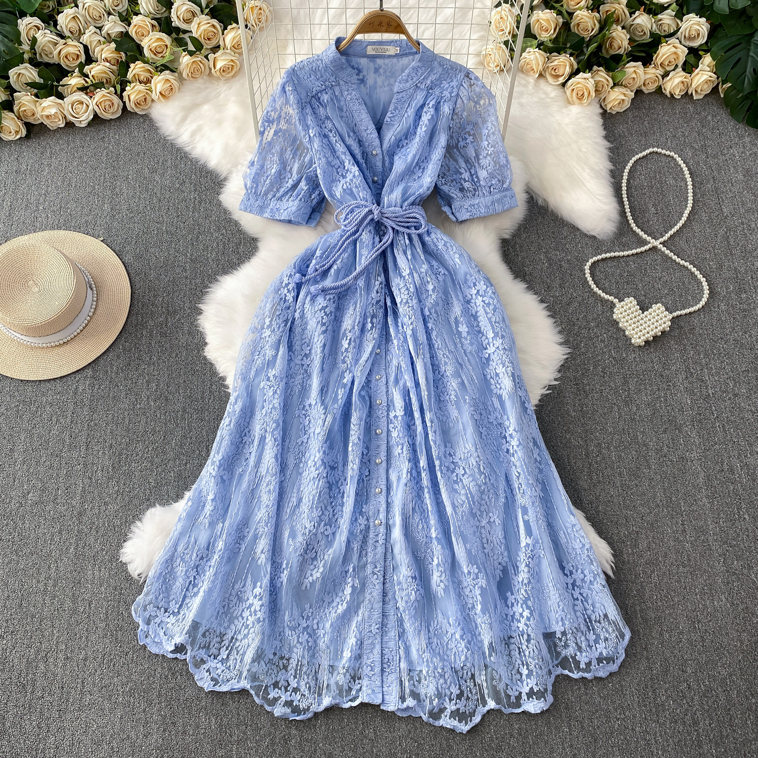 Gaun renda mewah Vietnam terbaru musim panas 2026, model niche dengan desain berongga yang rumit, gaun bergaya istana 1723.