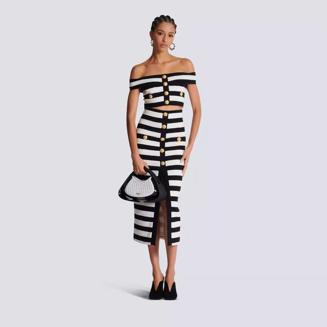 Rok Perban Garis Hitam Putih Produk Baru Lintas Batas Eropa Amerika Atasan Bahu Terbuka Modis Rok Panjang Dua Set Gaun Pesta Jalan Tinggi