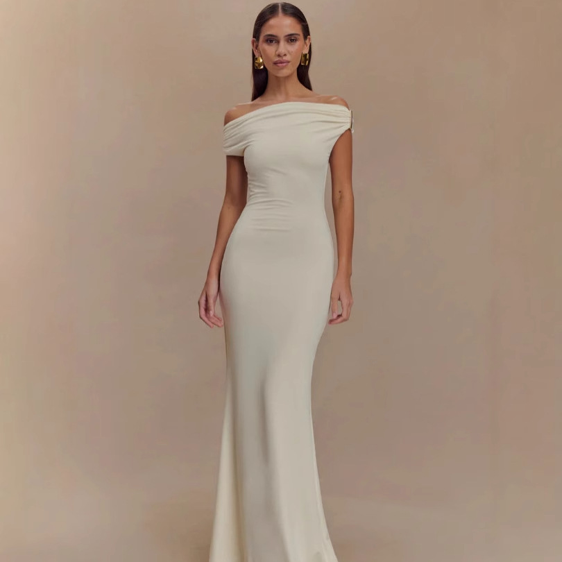 Gaun Pesta Makan Malam Warna Putih Membentuk Tubuh Elegan Gaya Eropa Amerika Gaun Bahu Bahu Bahu Tekstur Udara Gaun Malam Terlihat Langsing Lembut