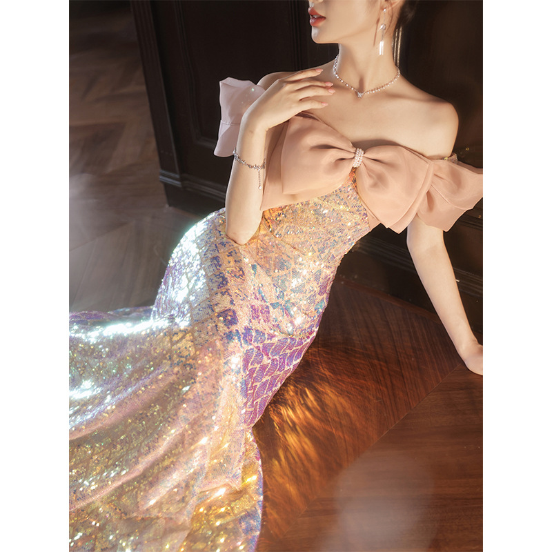 Gaun malam Off-shoulder untuk wanita 2024 gaun payet upacara seni ujian dewasa wisuda ulang tahun merah muda niche mewah ringan baru