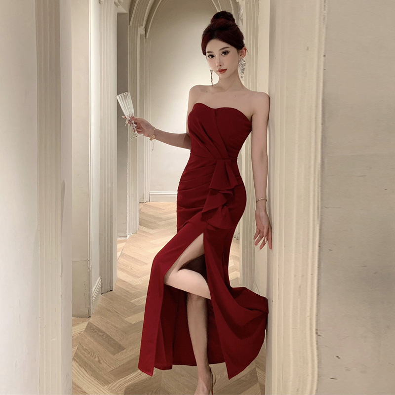 Gaun Gantung Leher Punggung Terbuka Kerah Dada Yujie Seksi Rok Gaun Malam Model Niche Tidak Memukul Gaya Desain Kelas Tinggi Wanita Musim Panas