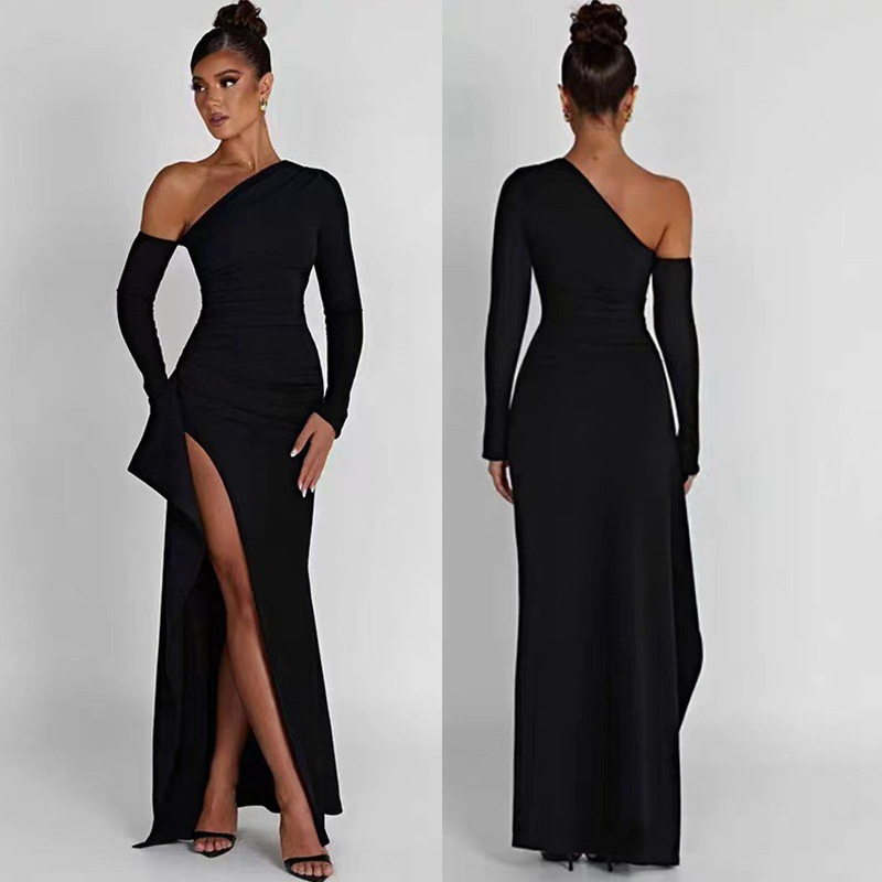 Gaun independen wanita perdagangan luar negeri lintas batas Eropa dan Amerika 2024 musim semi dan musim panas seksi elegan kerah miring gaun terpisah lengan tunggal