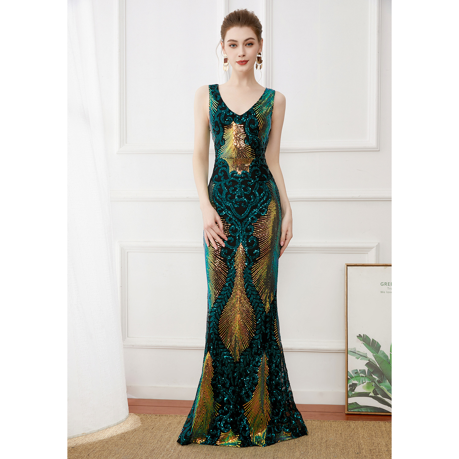 Gaun malam elegan payet untuk pesta malam baru gaun malam panjang model mobil etiket pameran acara tuan rumah gaun V-neck dalam