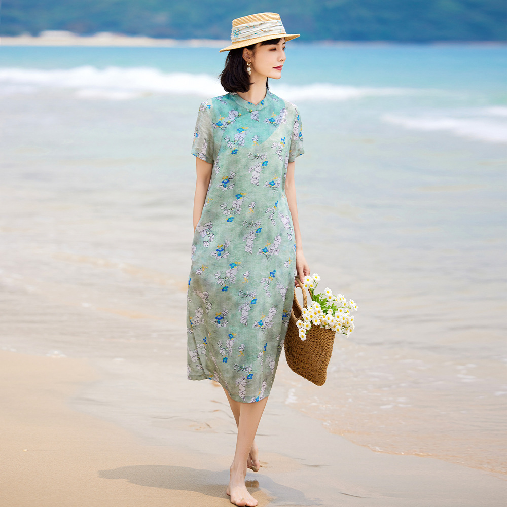 Gaun artistik gaya nasional kerah berdiri kecil retro cheongsam ditingkatkan cetak rami musim panas 2023
