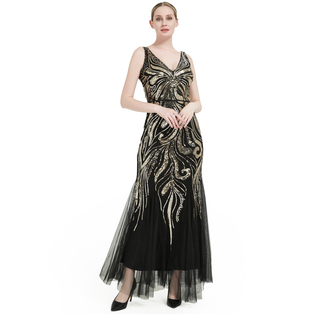 Gaun pernikahan panjang seksi leher V dalam pesta malam elegan jala berpayet retro lintas batas Eropa dan Amerika untuk wanita