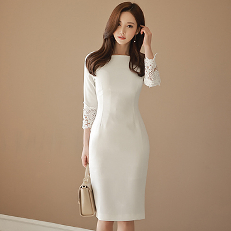 Gaun wanita elegan musim gugur 2025 dengan detail renda, kerah bulat, lengan tiga perempat, potongan ramping, dan model menempel di pinggul.