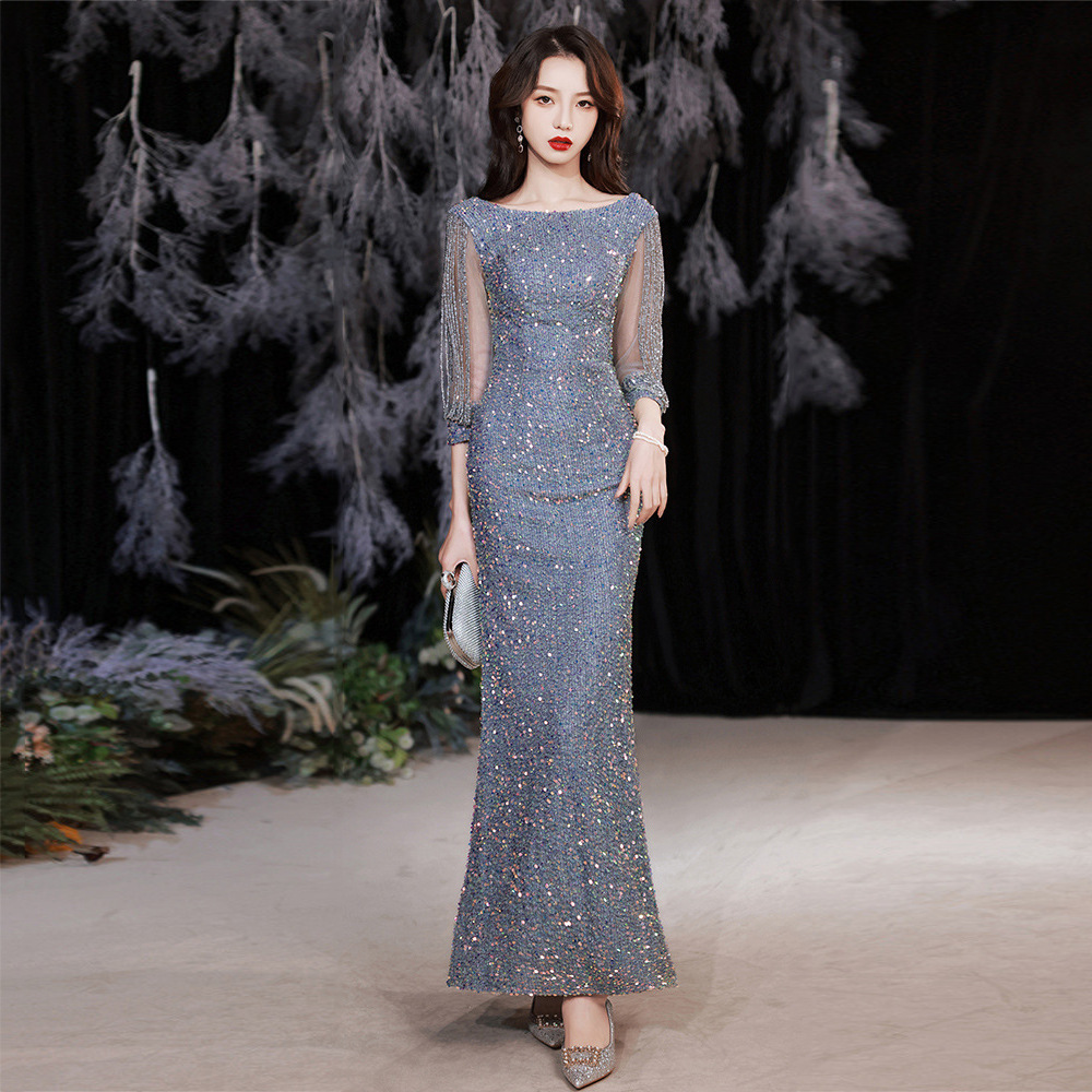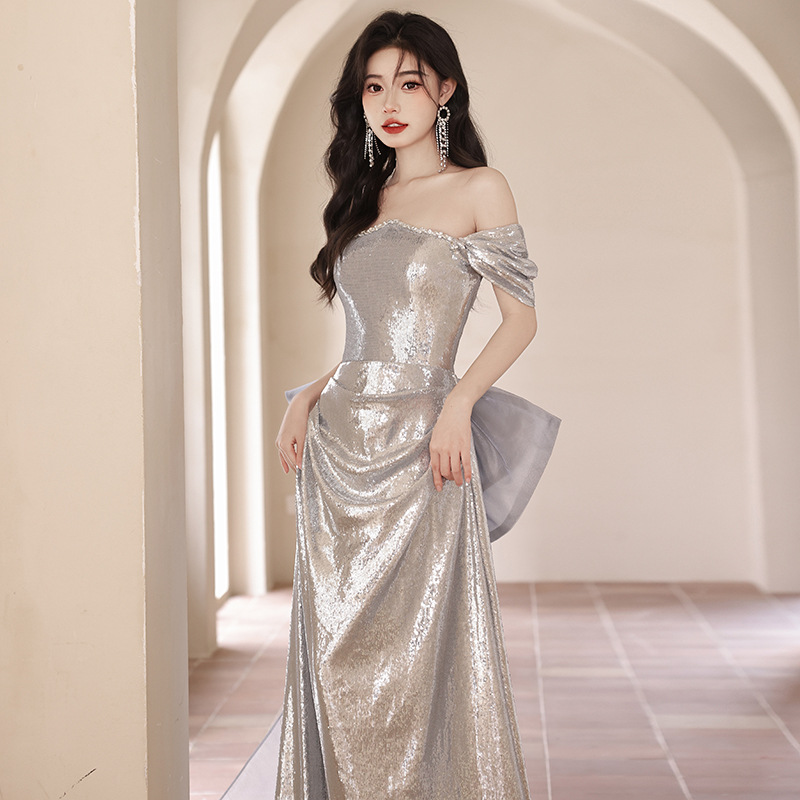 Gaun malam bahu terbuka untuk wanita, gaun tuan rumah temperamen kelas atas musim semi dan musim gugur baru 2024
